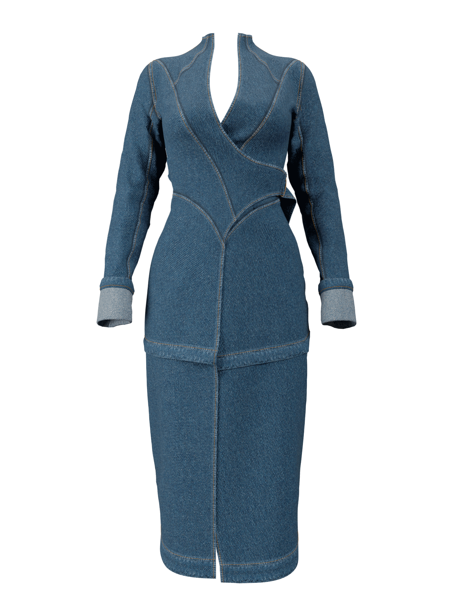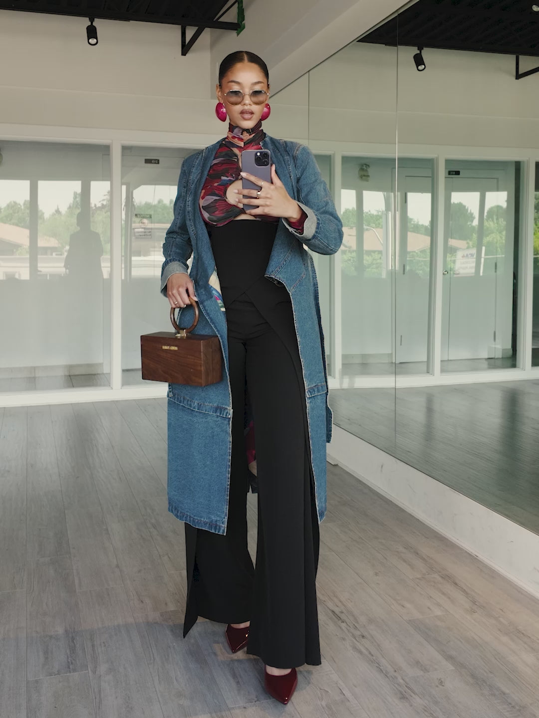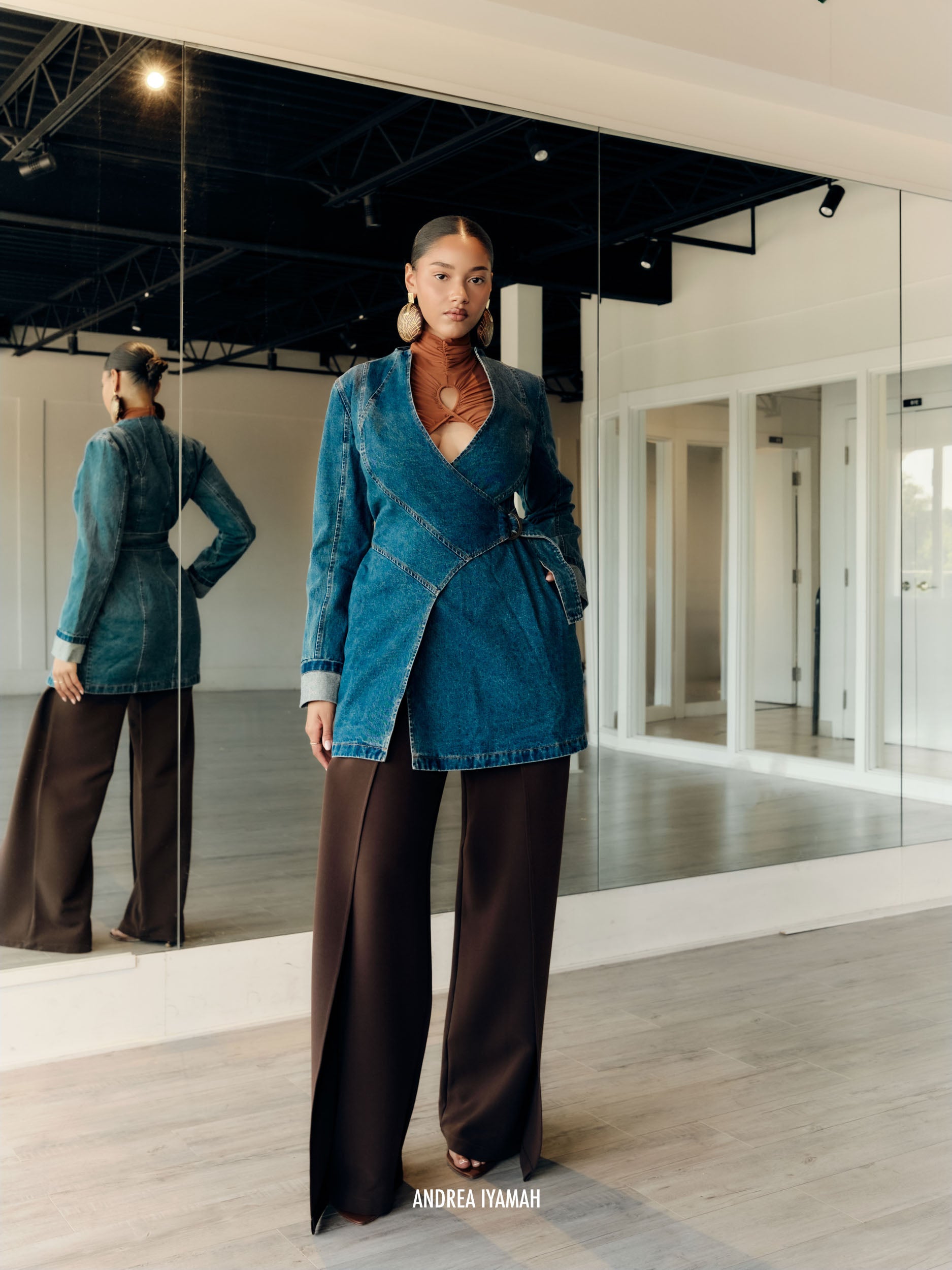 The Curva Denim Jacket is ANDREA IYAMAH'S very first jacket. It is a statement-making overcoat that seamlessly blends versatility with modern design. Crafted from premium denim, this calf-length piece features a structured funnel neck and a functional wrap design, secured at the waist with an external D-ring belt and an inner self-tie for a flawless fit. A detachable hem layer, fastened with concealed metal snaps, allows for two distinct length options, adapting effortlessly to your styling needs. Wide tacked cuffs reveal a raw denim underside for a touch of edge, while a back vent ensures ease of movement.