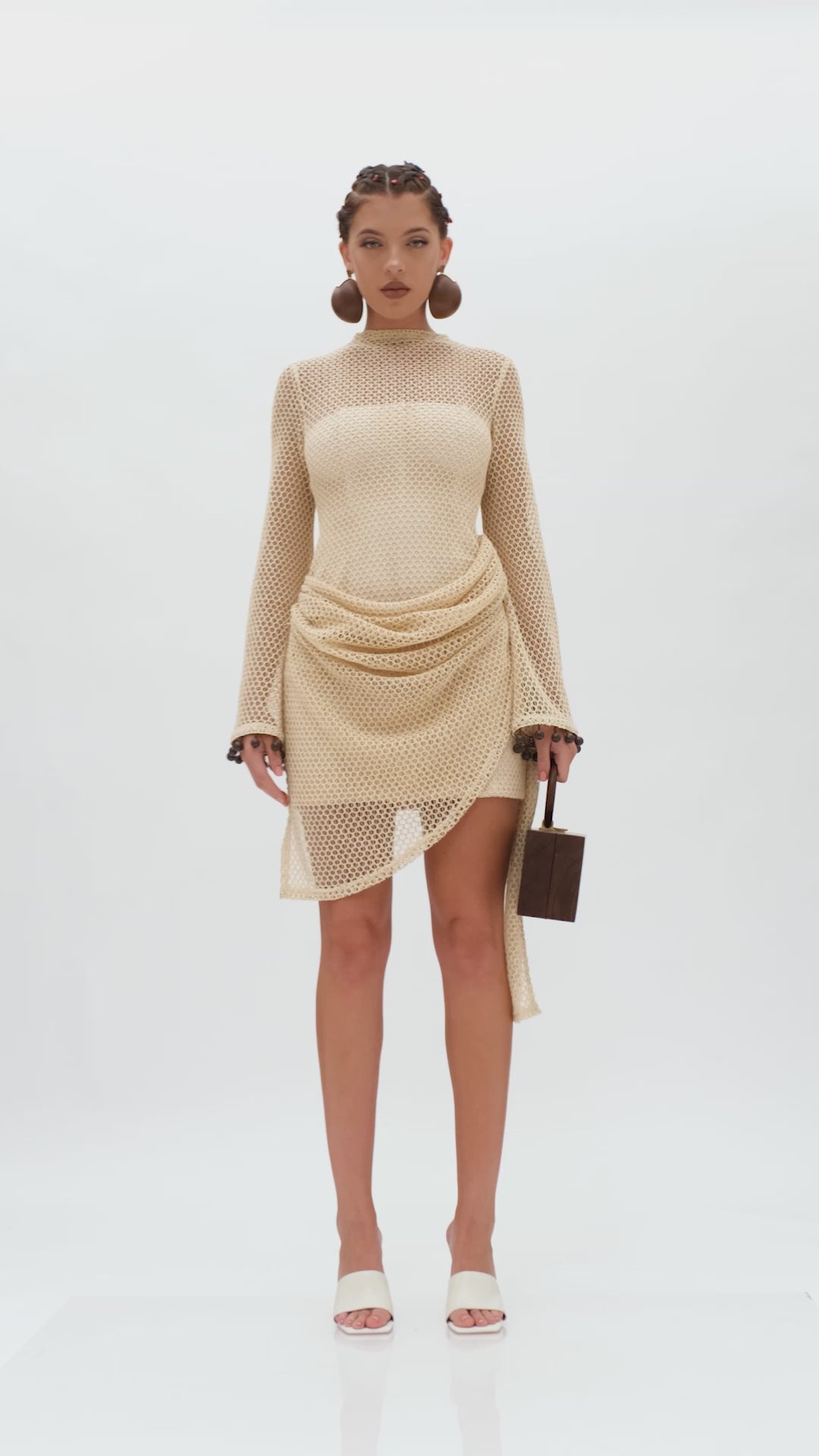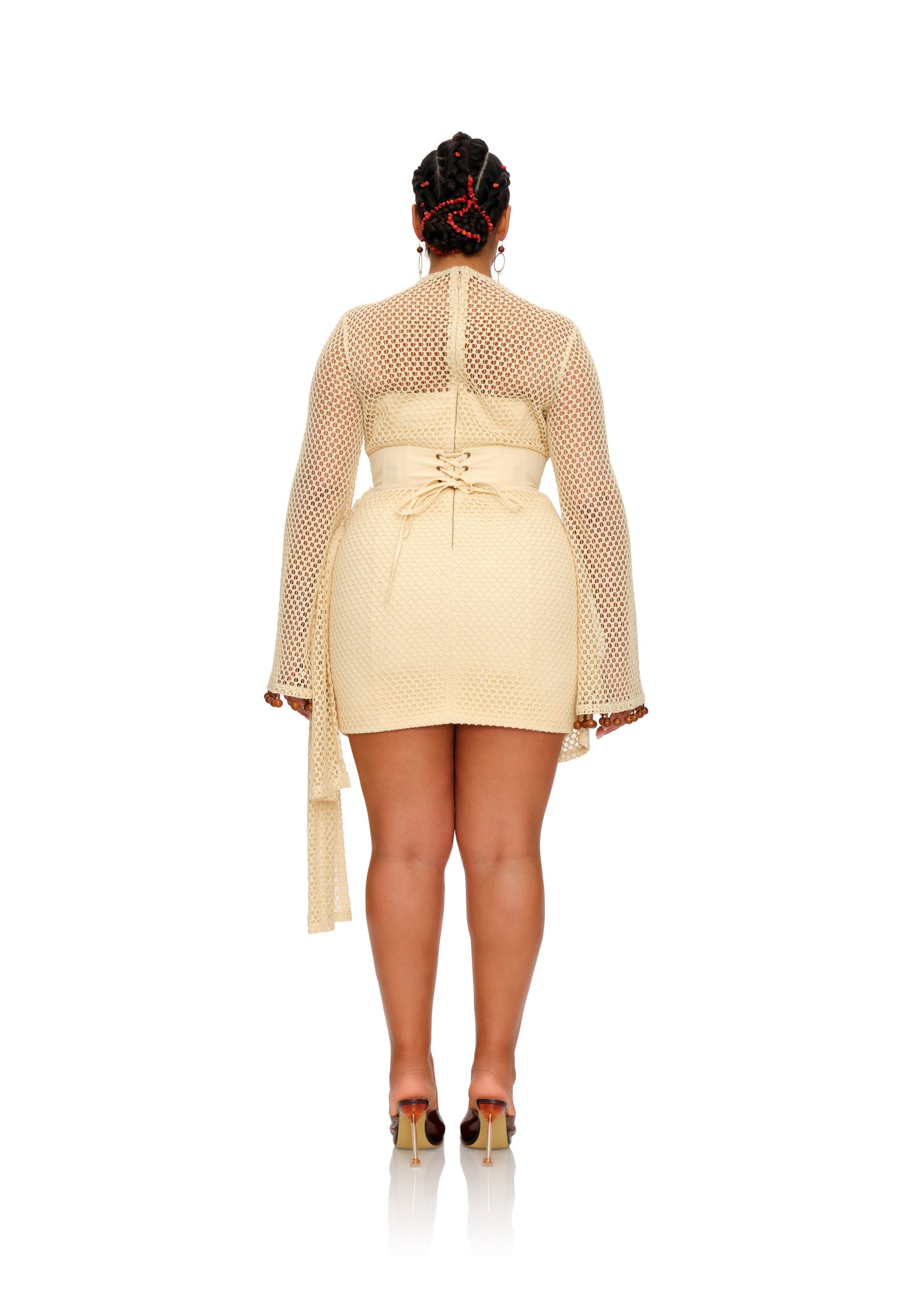 The EGU CROCHET DRESS is an ODE to the traditional wrapper tying culture of the Nigerian women who hail from it Southern parts. Designed with structure and drapery in mind, this masterfully constructed dress is a masterpiece to own. With flare sleeves, lined with wooden beads along the hem, it is impossible to not feel and exude the heart and love put into designing this piece. Pair with ANDREA IYAMAH accessories to complete the look.