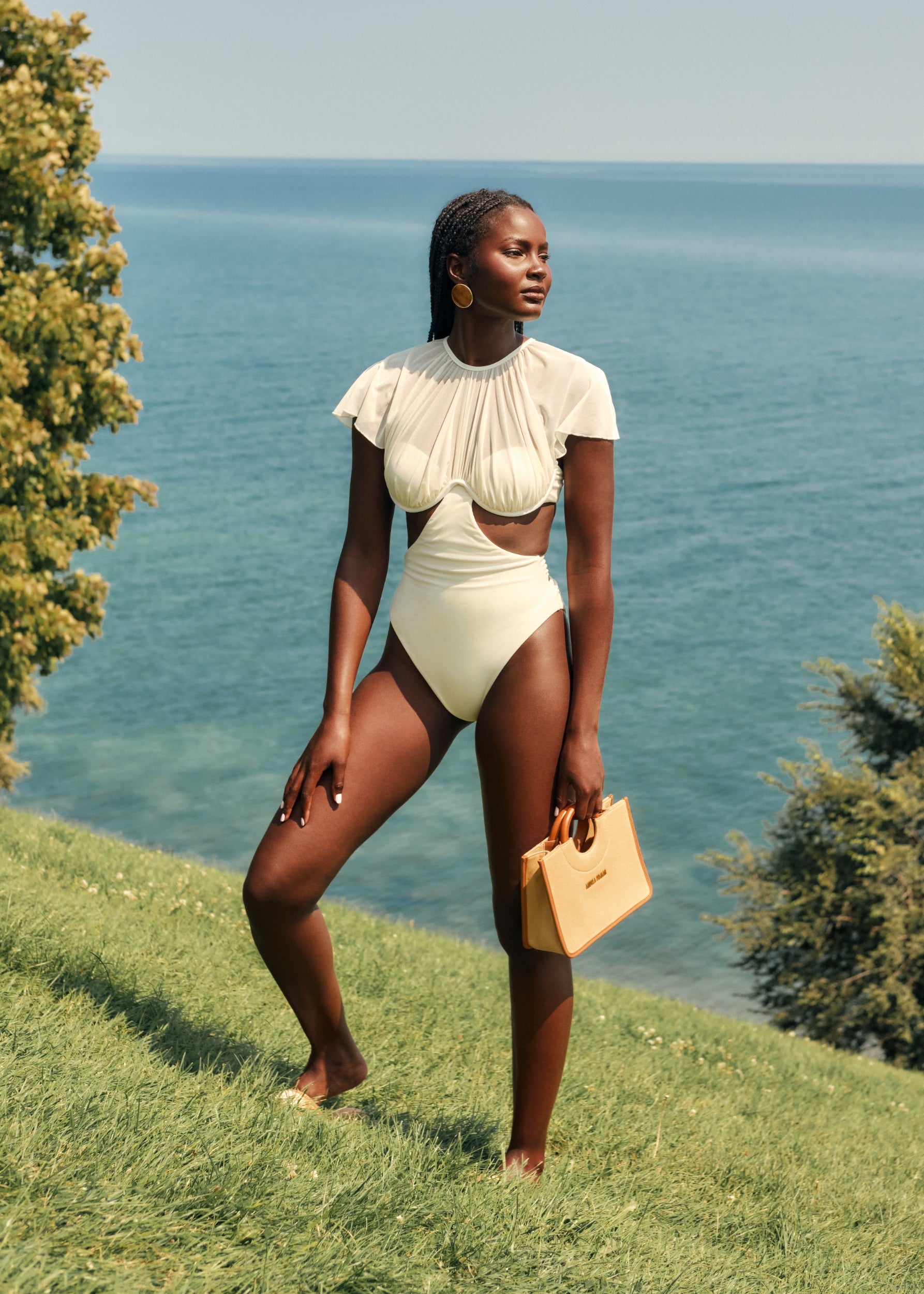 Introducing the NARU One-Piece Swimsuit, where refined design meets exceptional style in a timeless ivory color. This sophisticated swimsuit features W underwire for enhanced support and structure. A sheer mesh cape overlay adds a dramatic, ethereal touch, while additional mesh detailing on the main fabric offers a hint of allure. The adjustable hook closures on the neck and back ensure a customized fit, and the functional lace-up corset detail provides both visual interest and support. Molded cups complete the design, offering a smooth and flattering silhouette. Perfect for those seeking elegance and functionality, the NARU One-Piece Swimsuit is your go-to choice for making a chic statement by the water.
