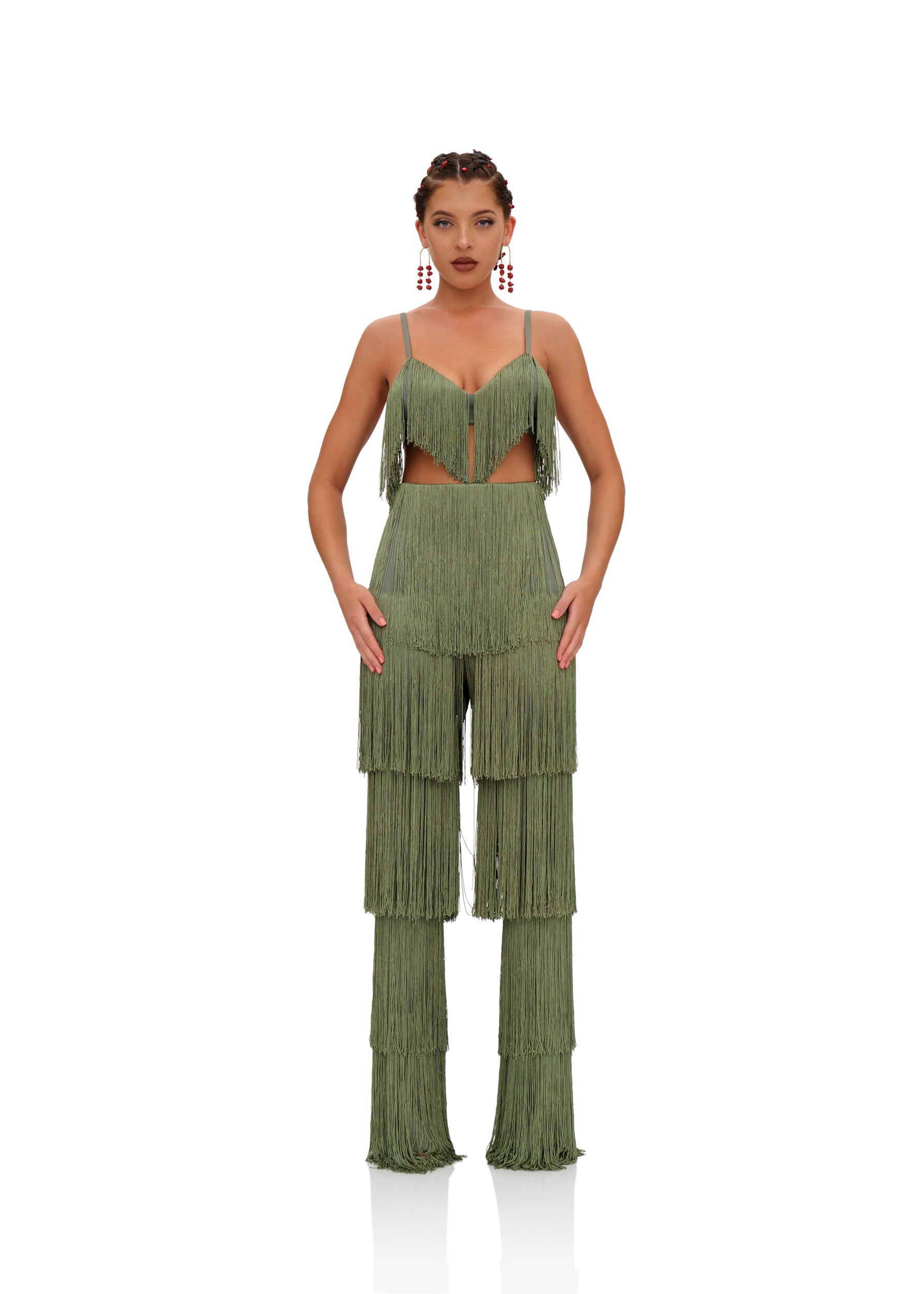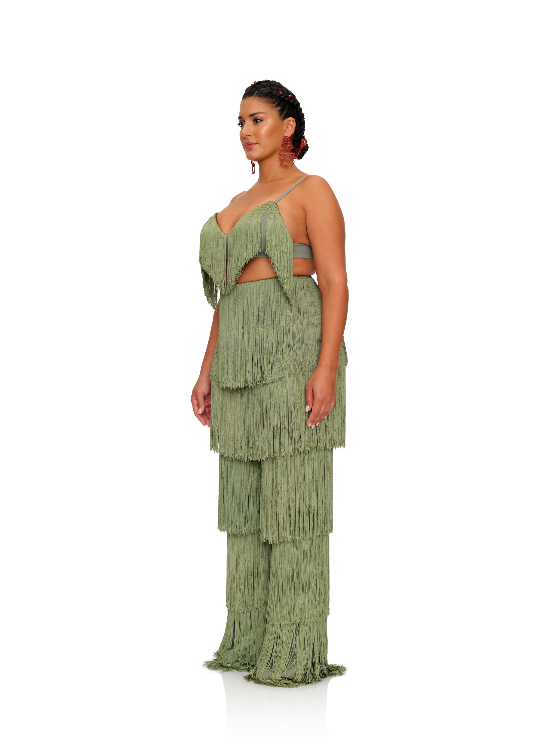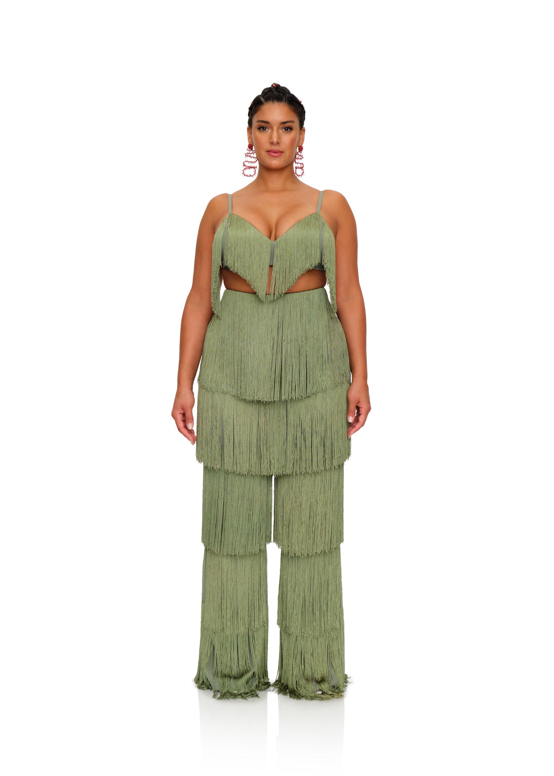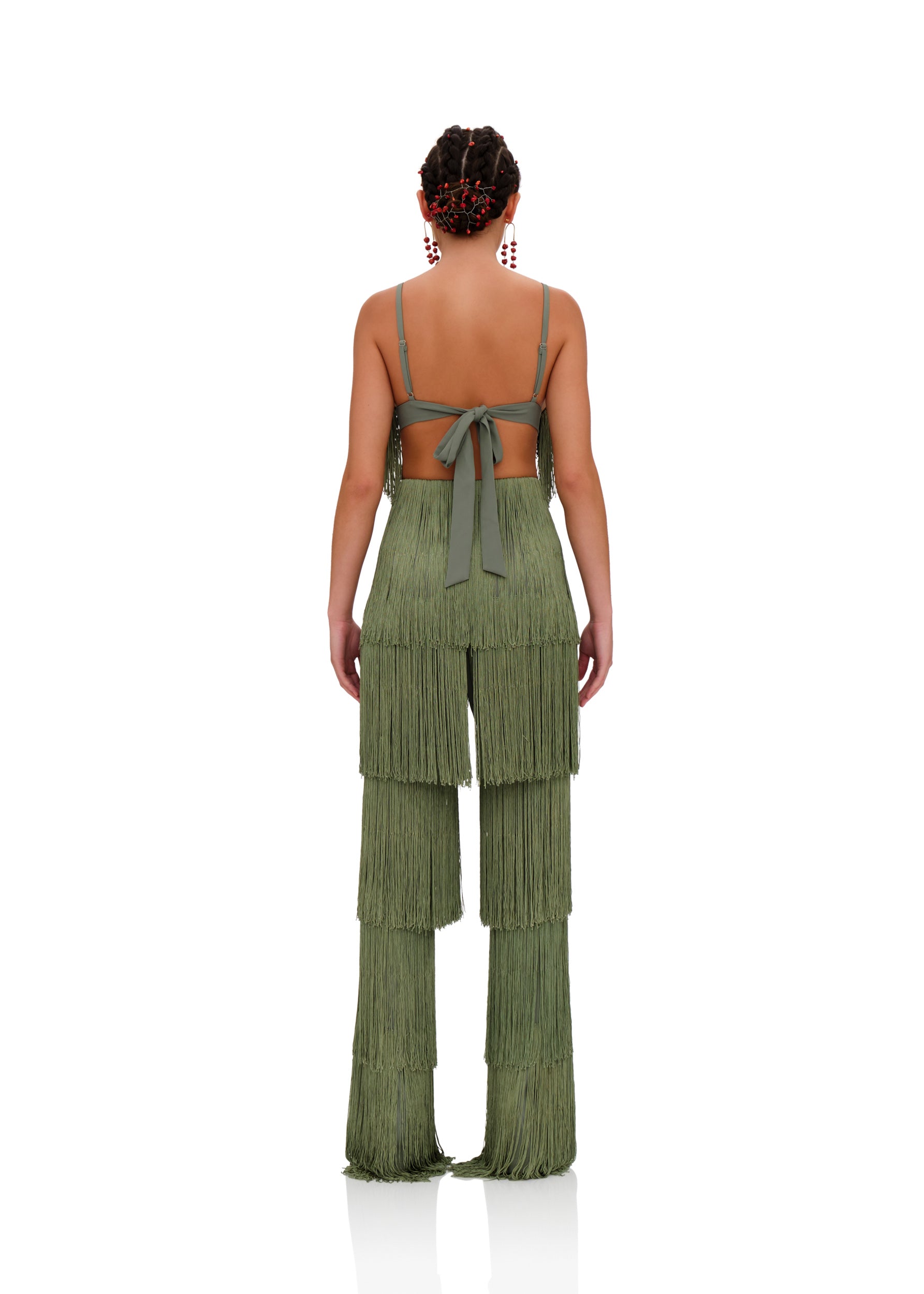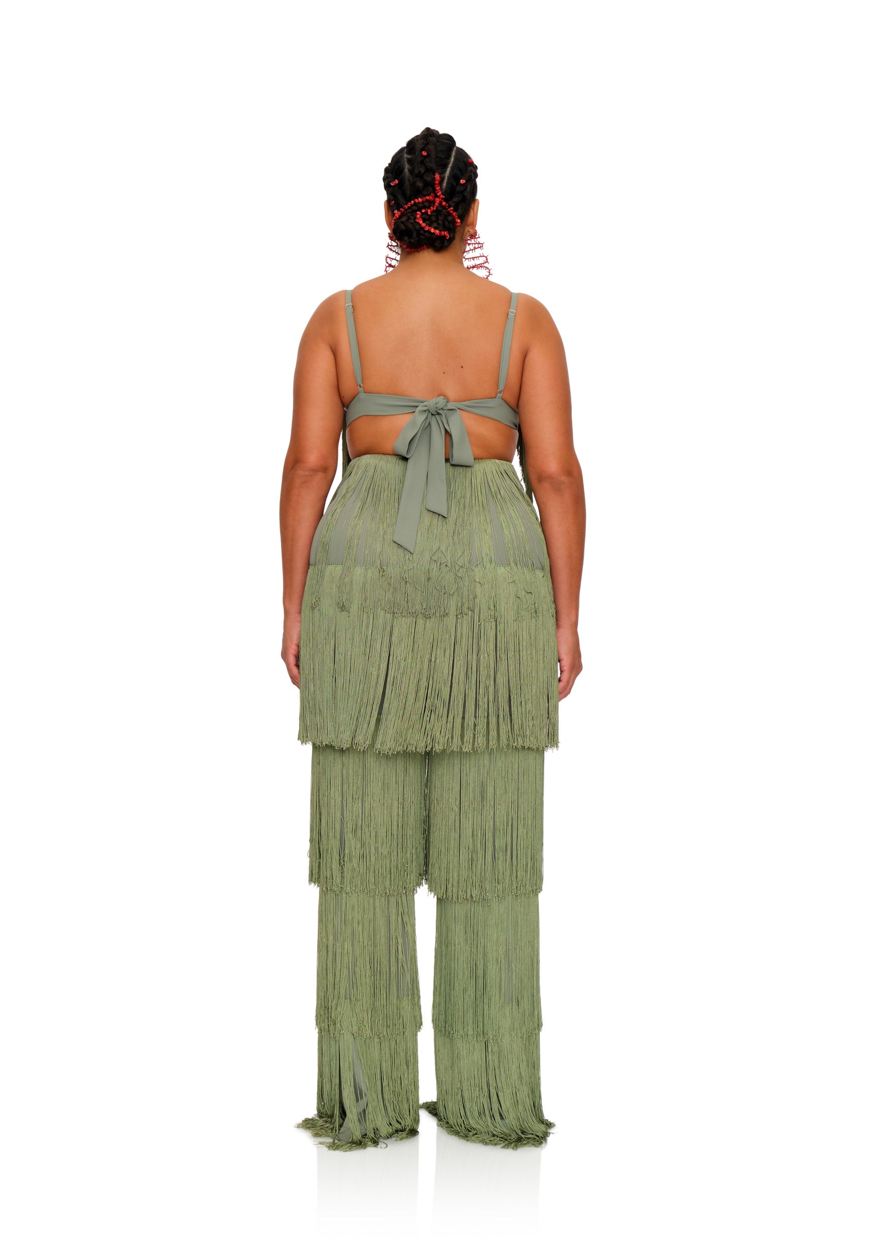 Delicately placed layers of fringe with this ROSEMARY green hue that fits all skintones is the OBI FRINGE PANTS. It sways and struts with with you so seemlessly that every way will become your runway. Designed to depict 'dance' as a celebration, these pants celebrate not just the occasion but the dancer. Featuring a high rise waistline, the hips will feel right at home in this number. Pair it with its matching OBI FRINGE BRALETTE to complete the look.