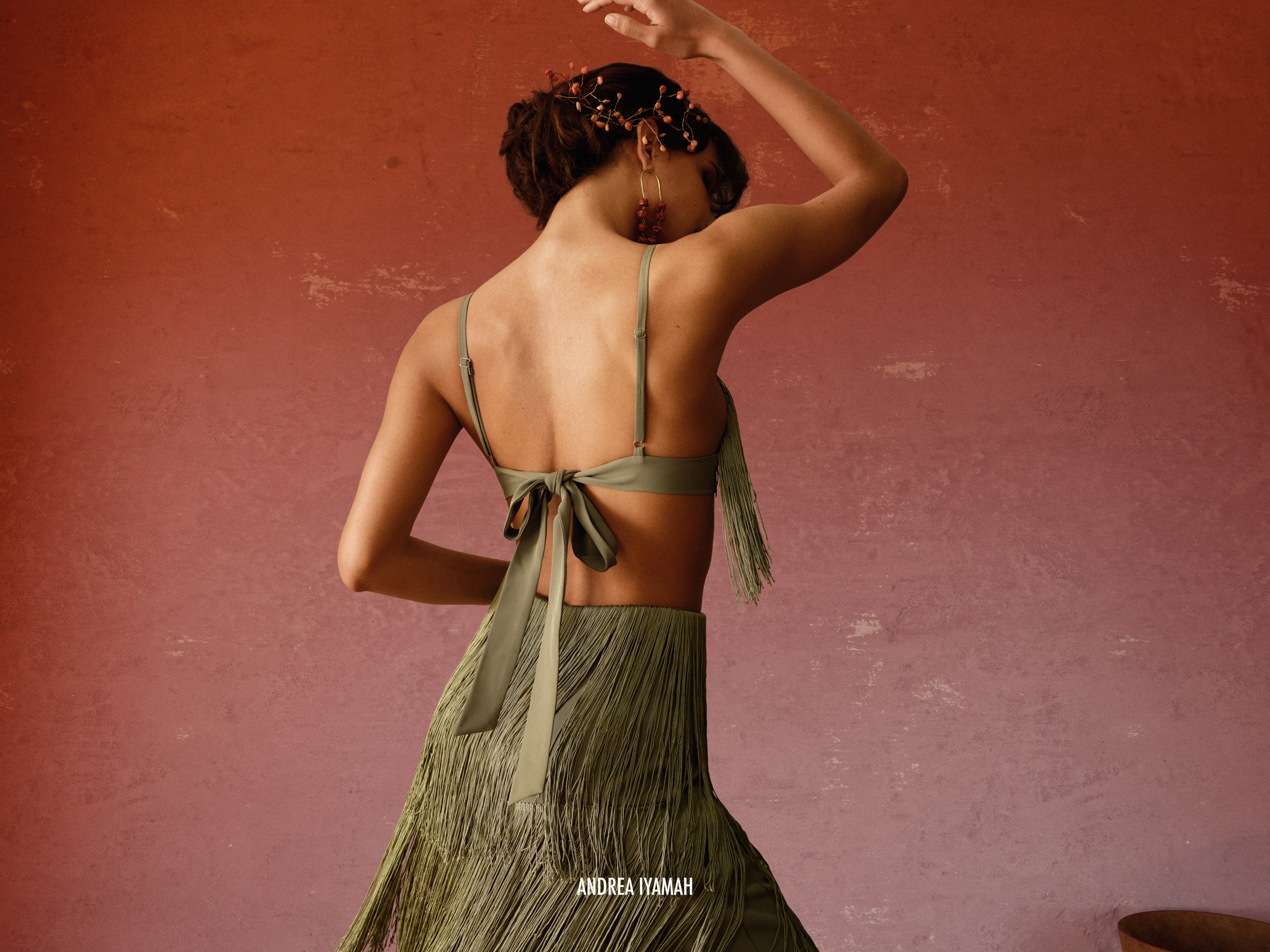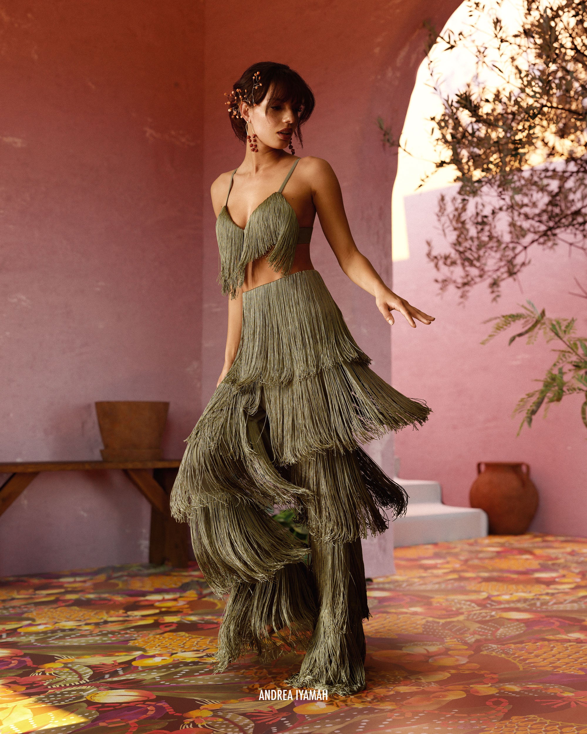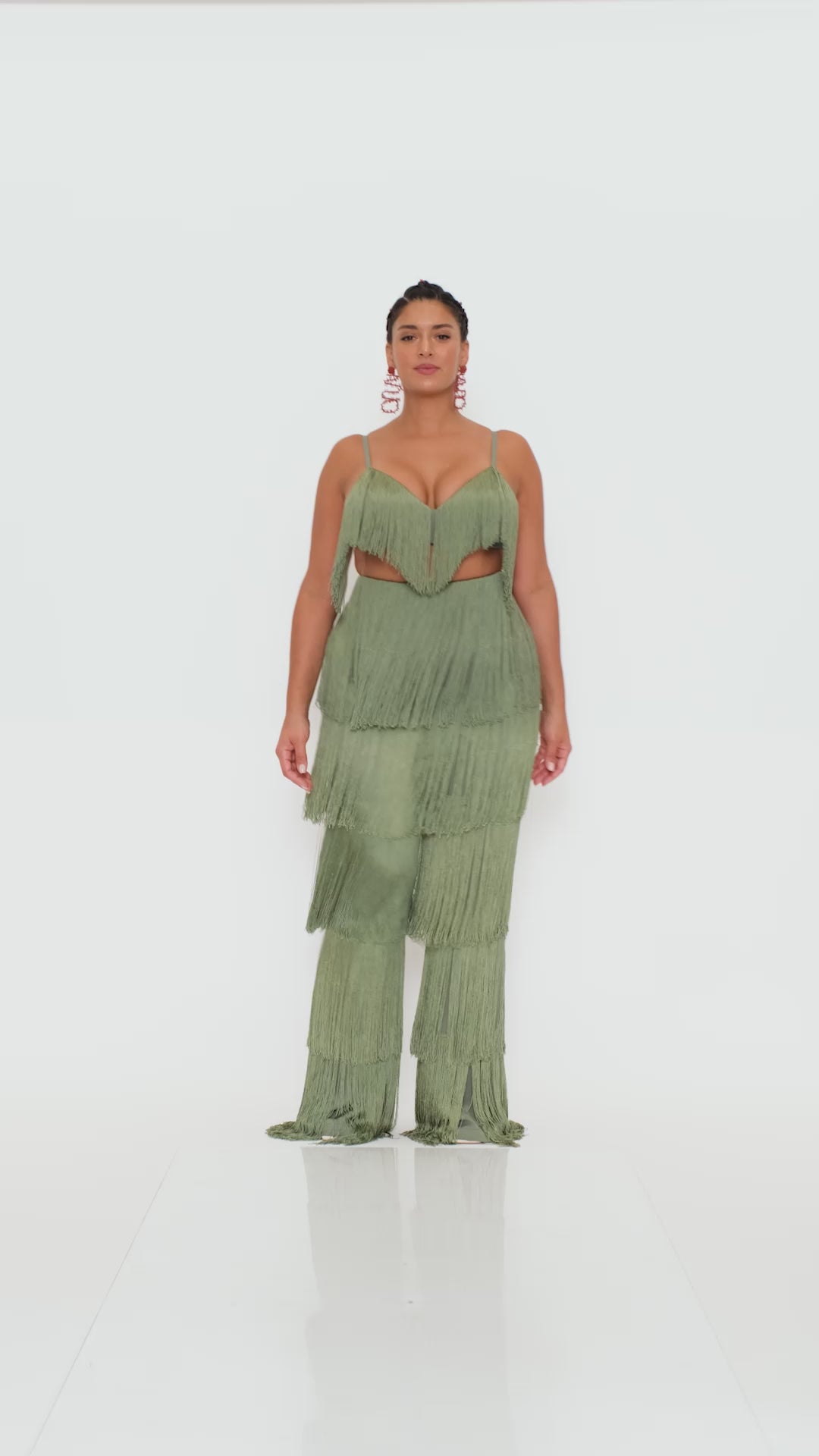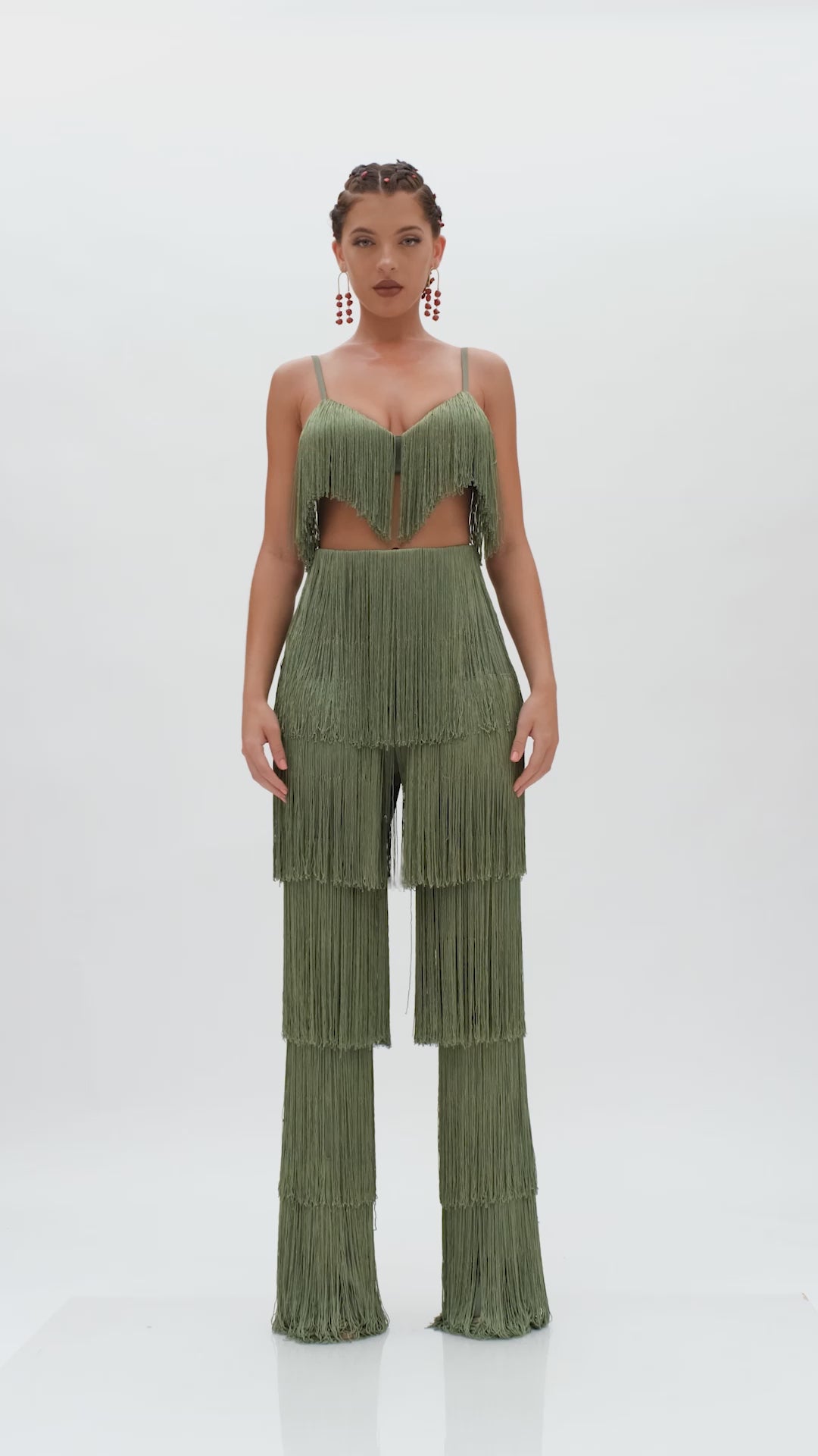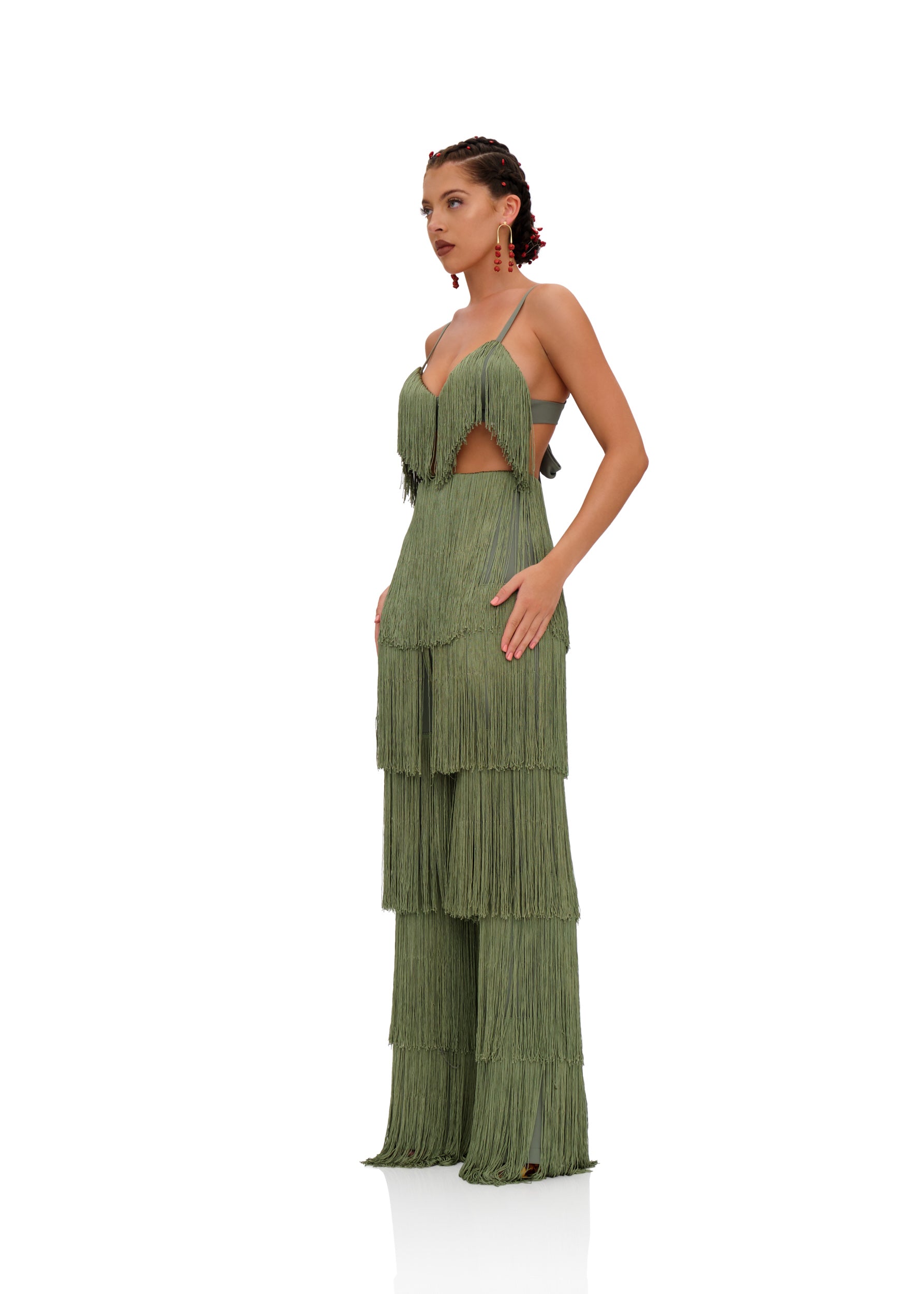 Delicately placed layers of fringe with this ROSEMARY green hue that fits all skintones is the OBI FRINGE PANTS. It sways and struts with with you so seemlessly that every way will become your runway. Designed to depict 'dance' as a celebration, these pants celebrate not just the occasion but the dancer. Featuring a high rise waistline, the hips will feel right at home in this number. Pair it with its matching OBI FRINGE BRALETTE to complete the look.