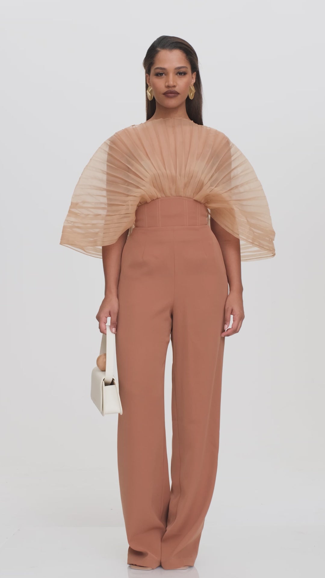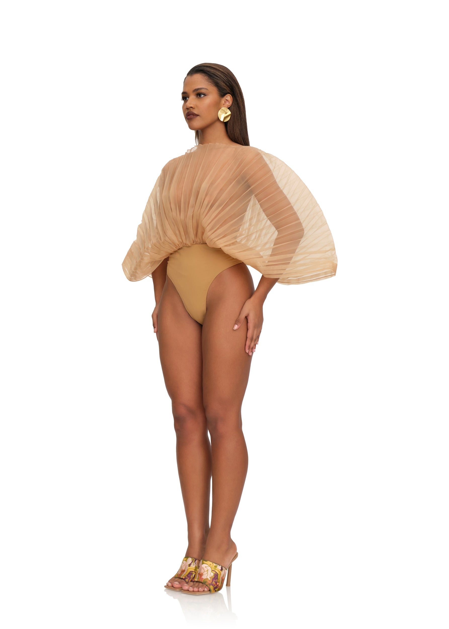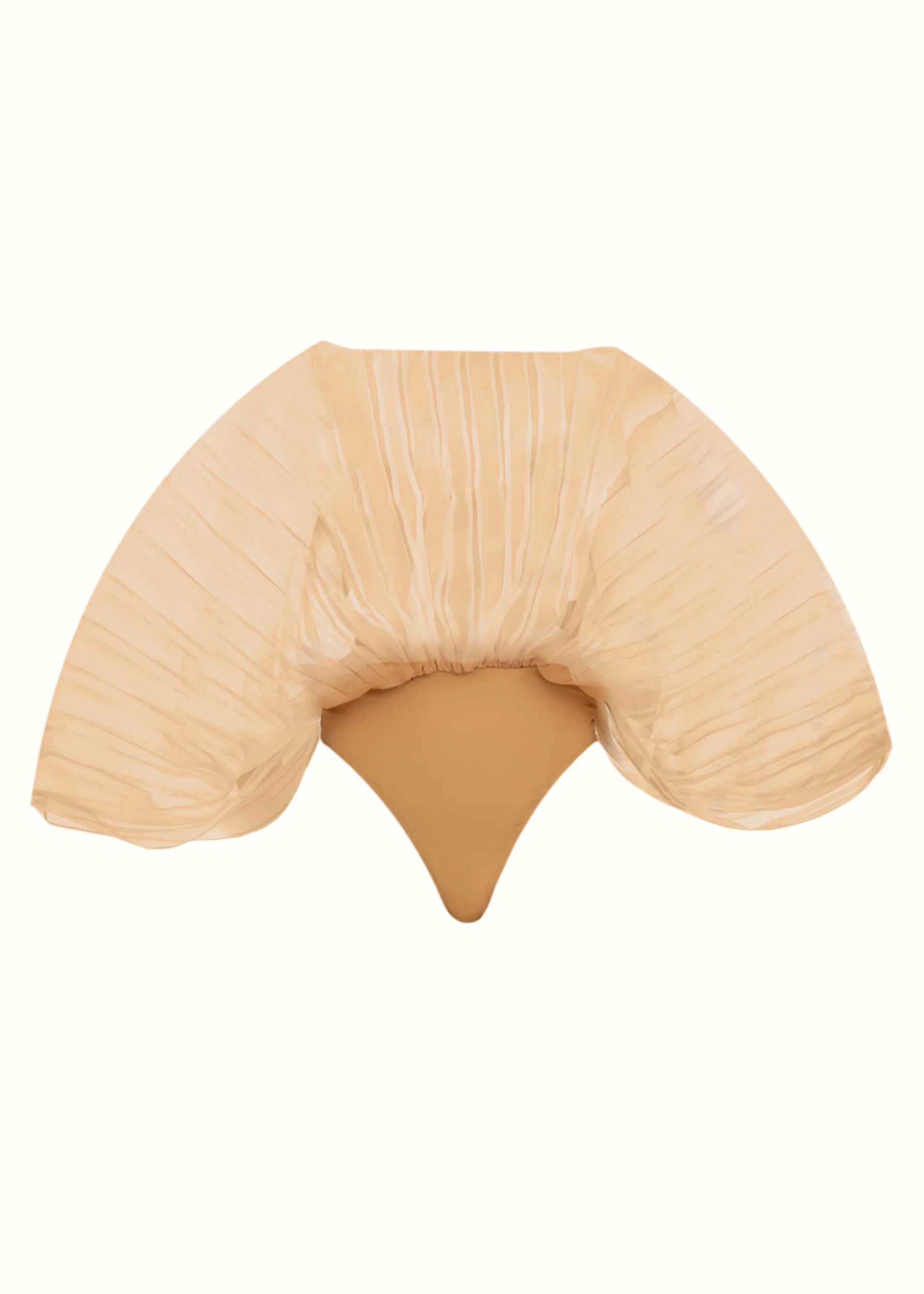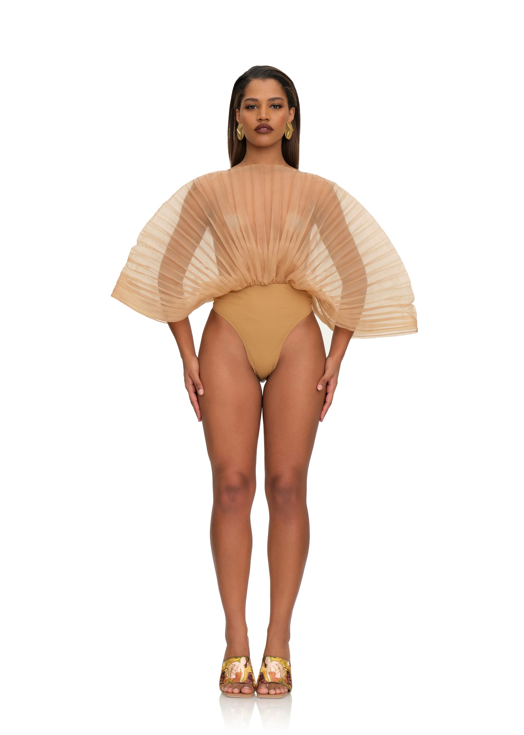 The SOMBRA thong bodysuit is a sculptural masterpiece and is back in a unique sand hue. Playing on the delicate nature of organza and the textural appeal of pleats, this style was inspired by the unique patterns and proportions of mushroom caps. The SOMBRA leotard features an inner knit leotard layer with a convenient snap closure. Confidently pair the SOMBRA leotard with our SITA HIGH WAIST CORSET PANTS or the SITA CORSET SKIRT.