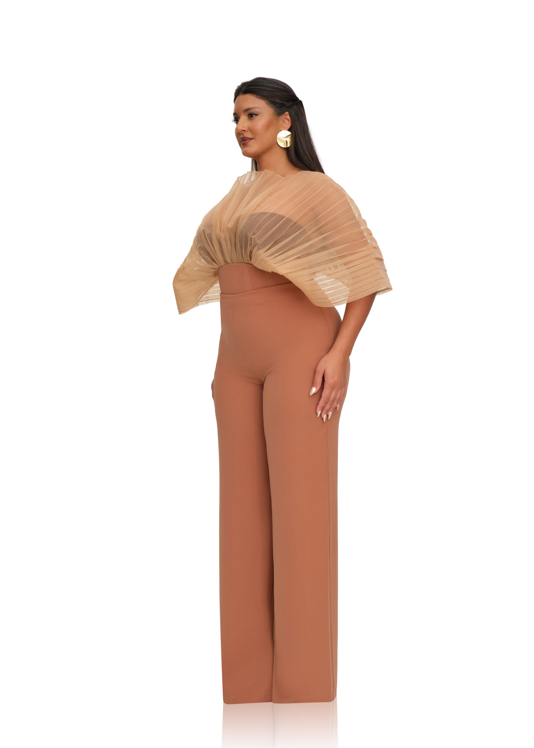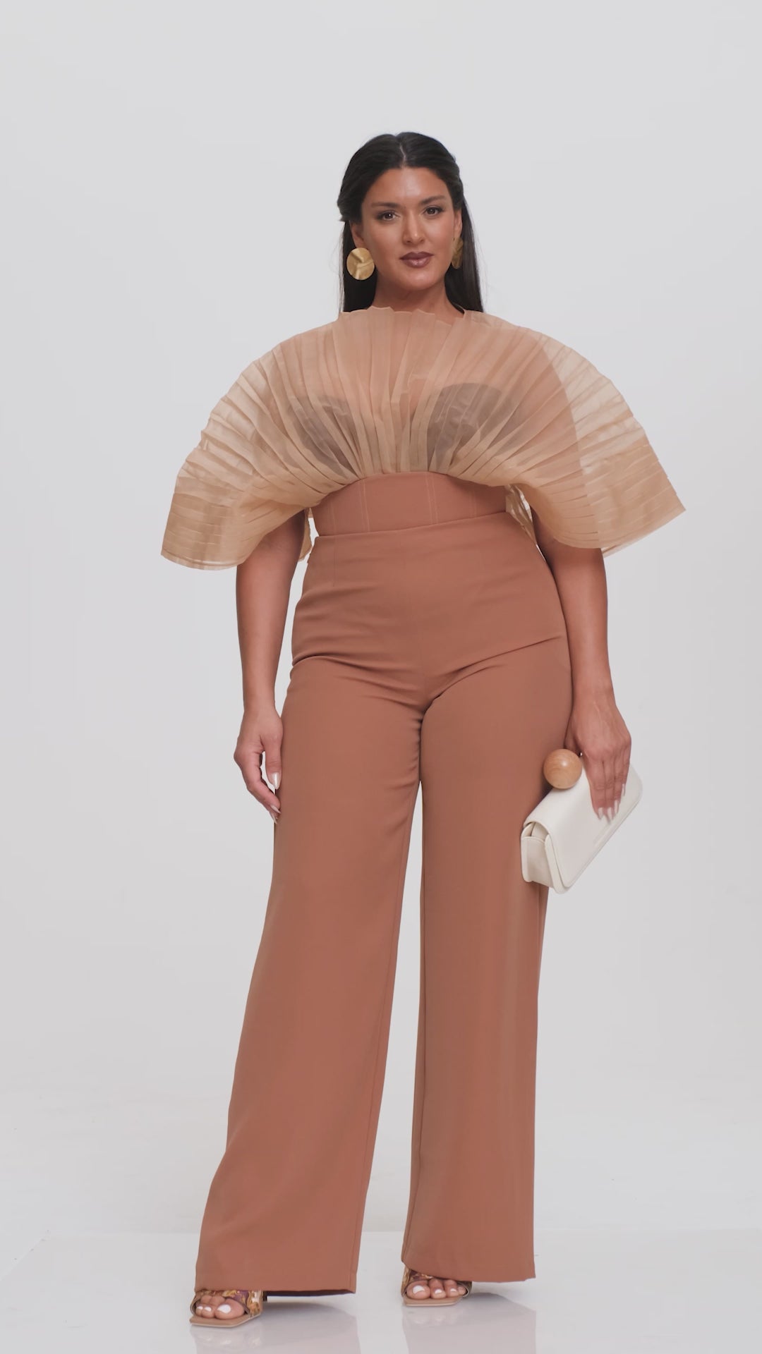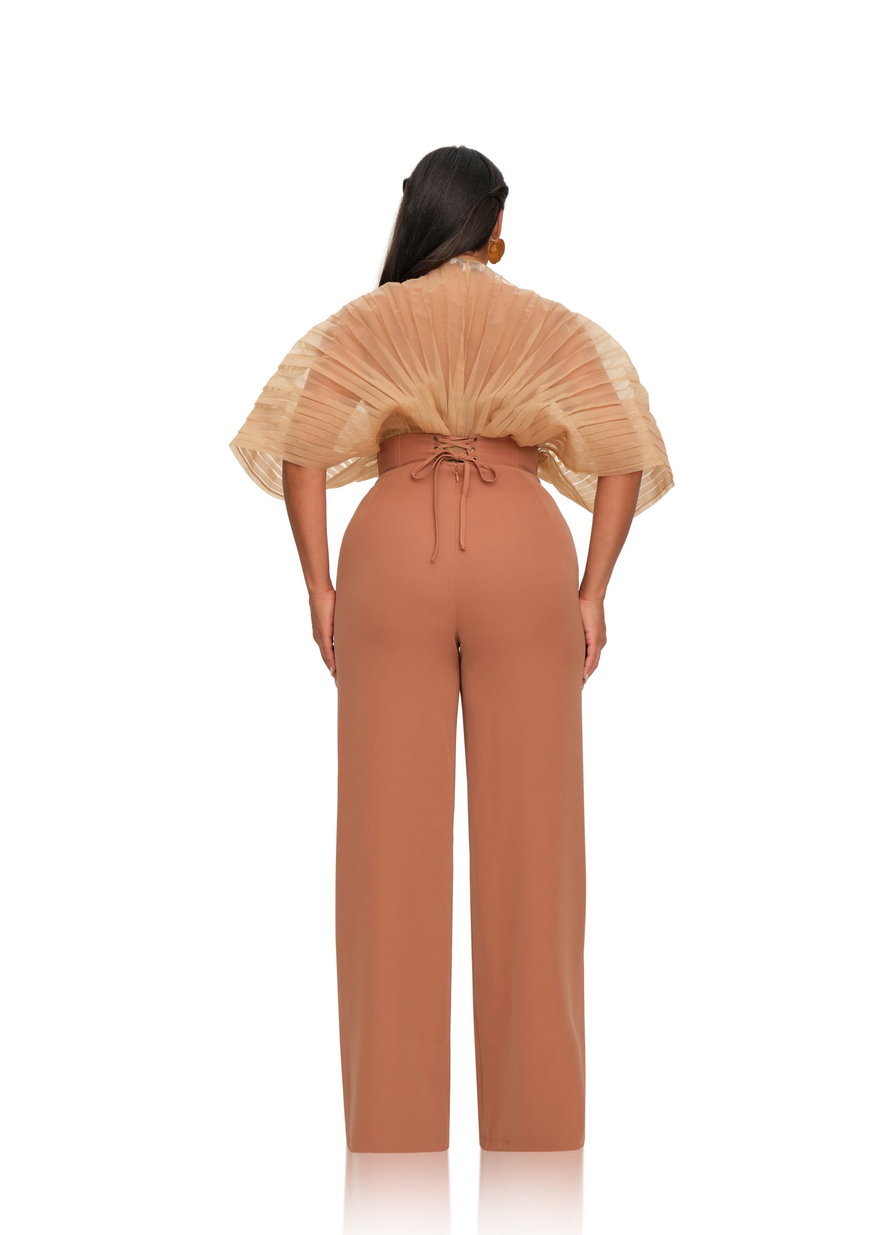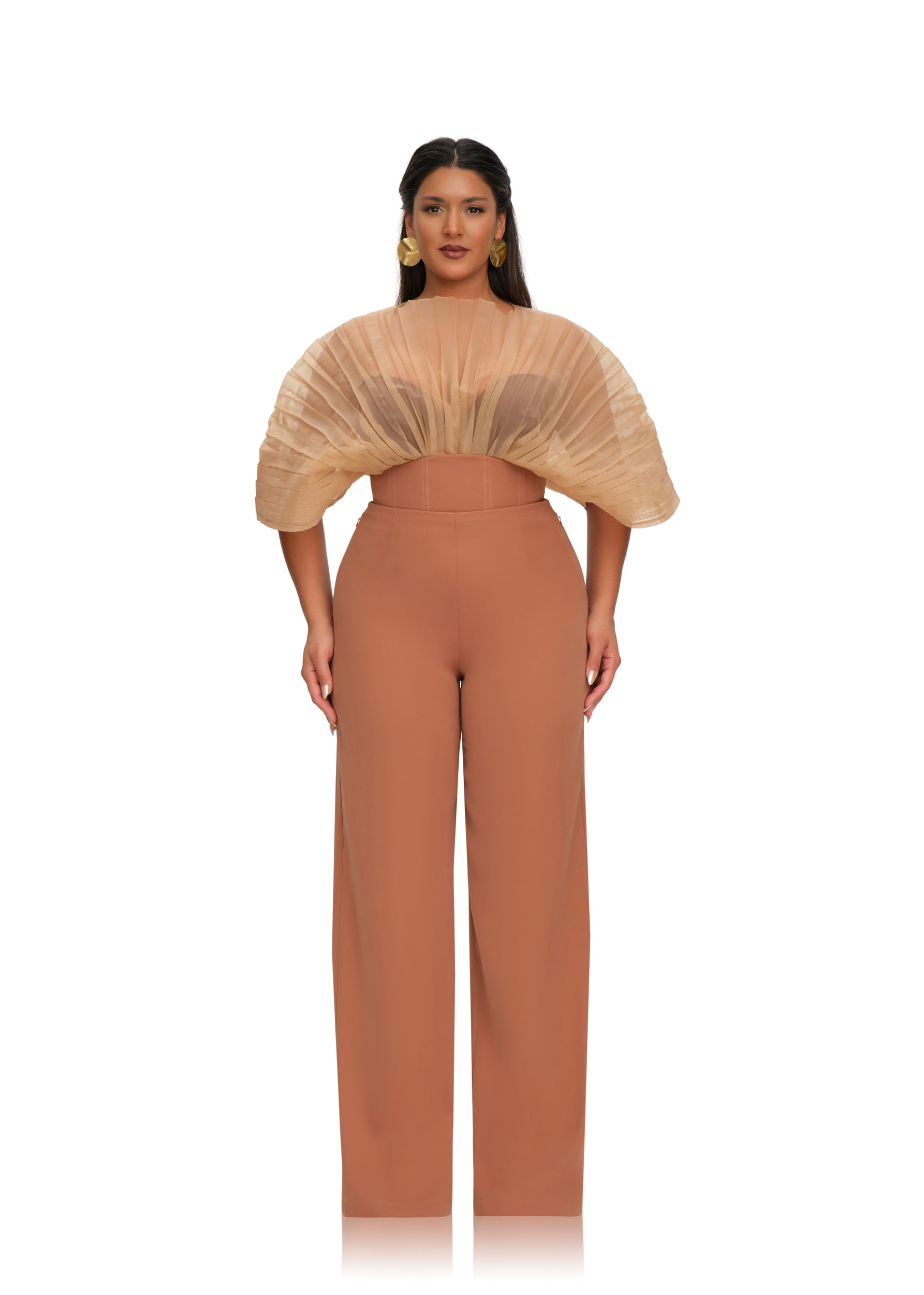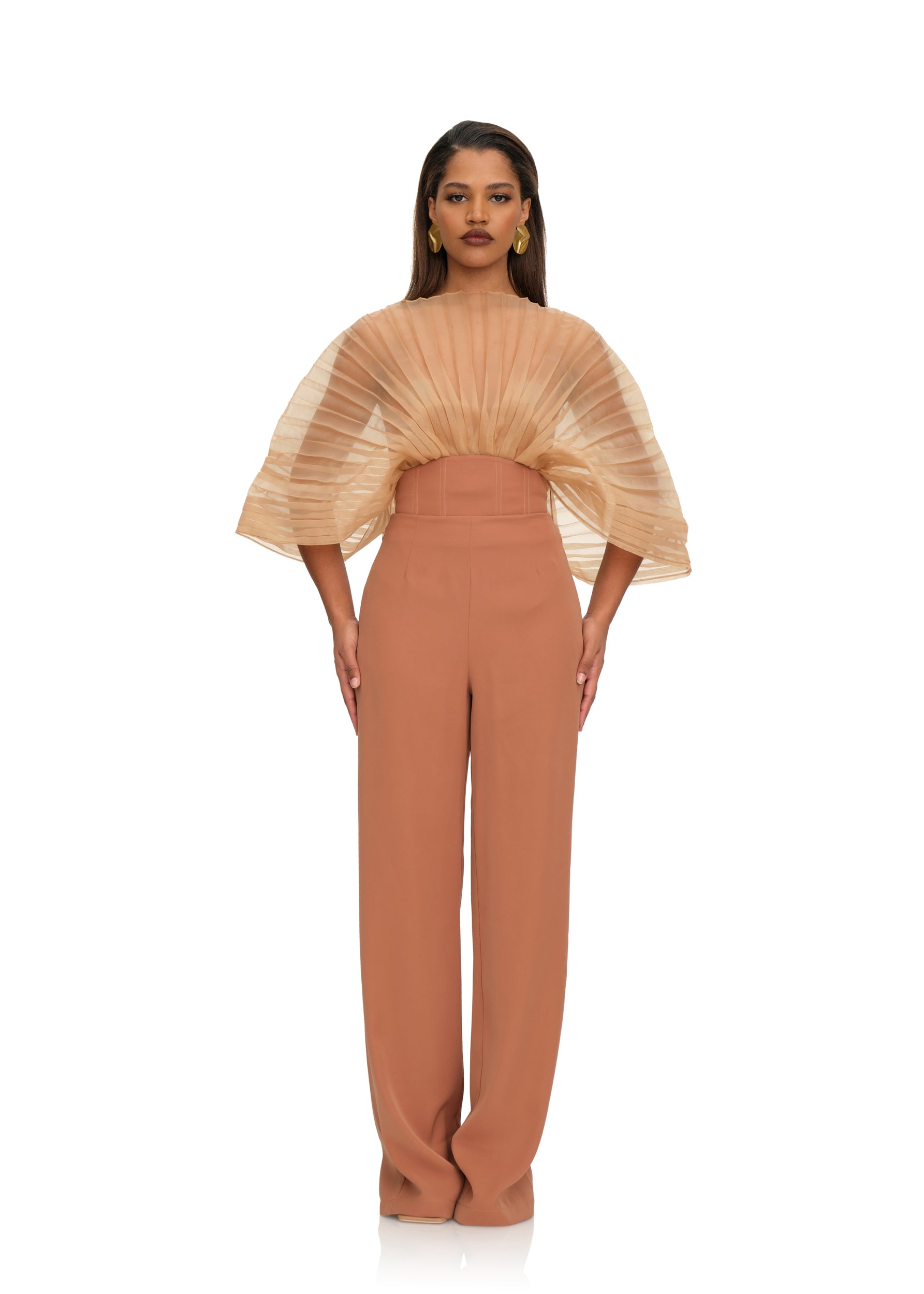 The SOMBRA thong bodysuit is a sculptural masterpiece and is back in a unique sand hue. Playing on the delicate nature of organza and the textural appeal of pleats, this style was inspired by the unique patterns and proportions of mushroom caps. The SOMBRA leotard features an inner knit leotard layer with a convenient snap closure. Confidently pair the SOMBRA leotard with our SITA HIGH WAIST CORSET PANTS or the SITA CORSET SKIRT.