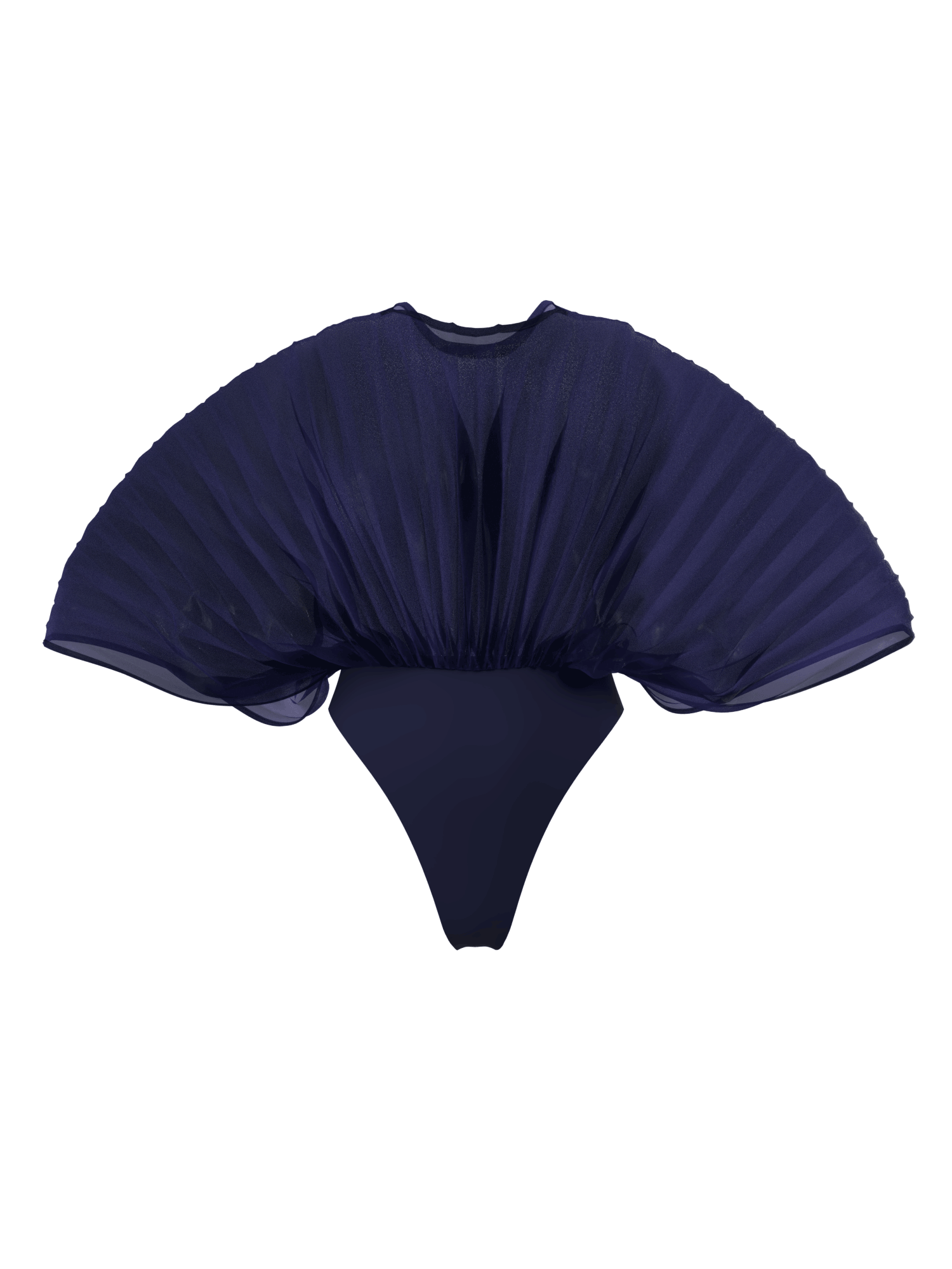 The SOMBRA bodysuit is a sculptural masterpiece and is back in an INDIGO hue. Playing on the delicate nature of organza and the textural appeal of pleats, this style was inspired by the unique patterns and proportions of mushroom caps. The SOMBRA bodysuit features an inner knit leotard layer with a convenient snap closure. Confidently pair the SOMBRA leotard with the NEVY DENIM PANTS.