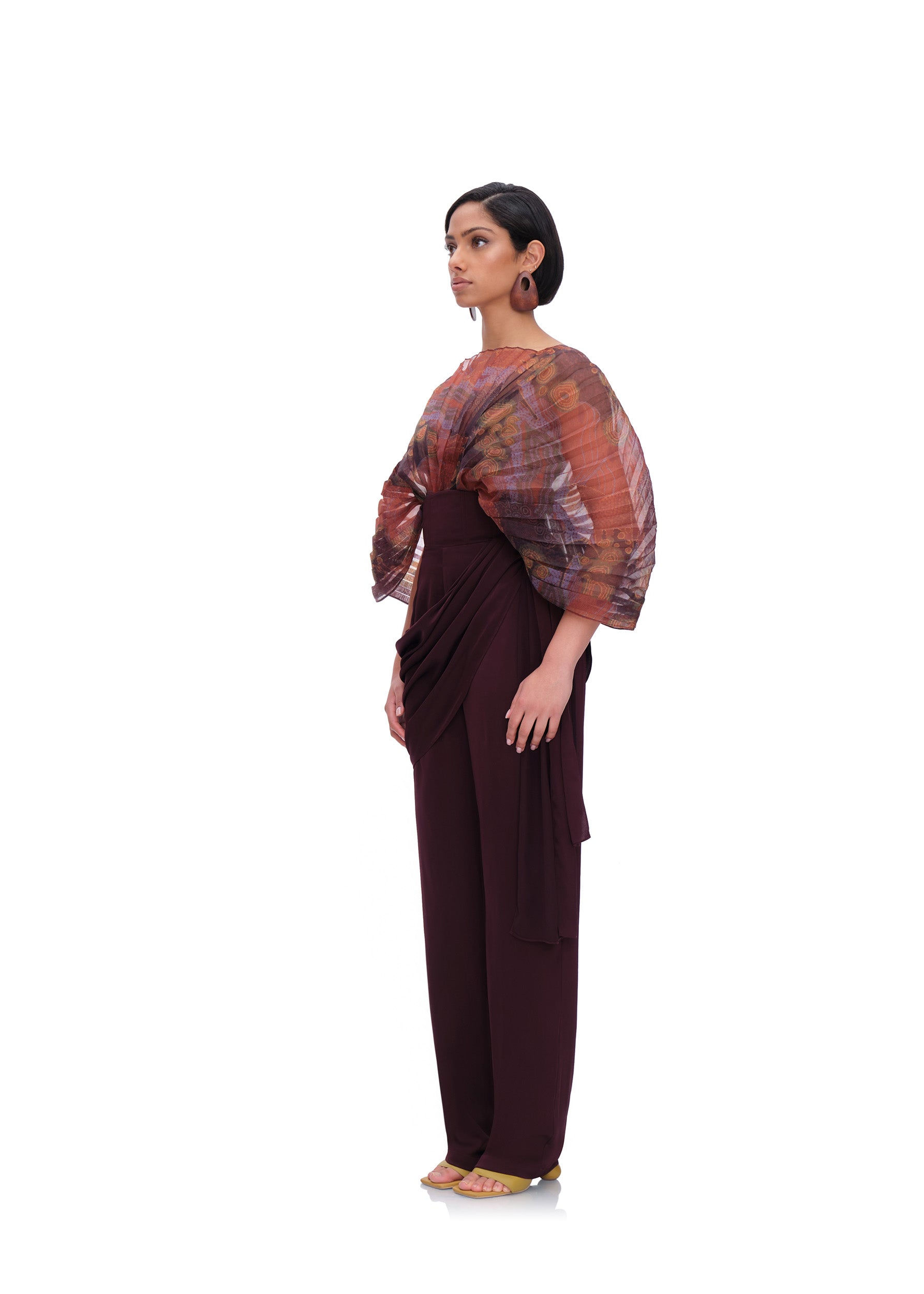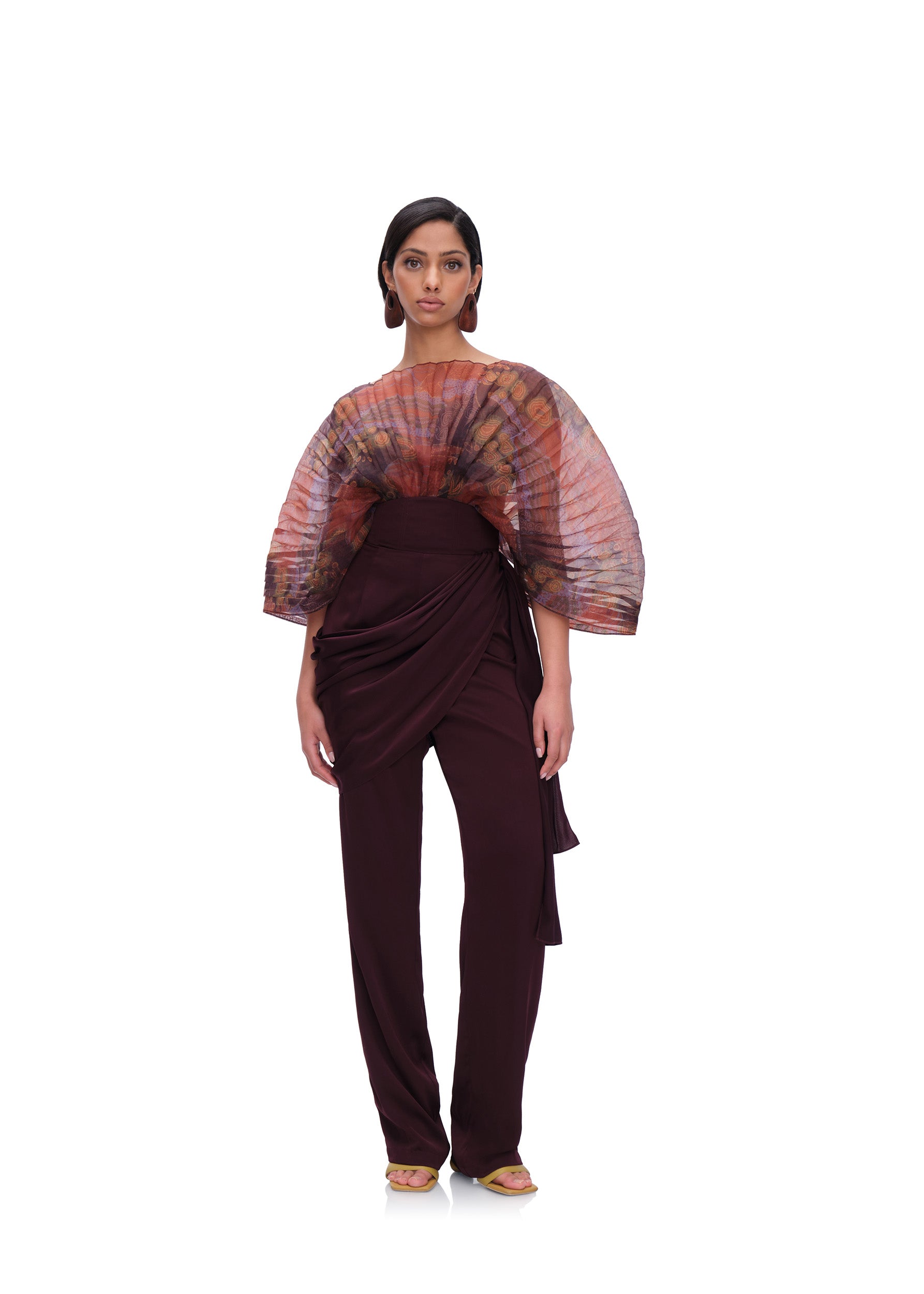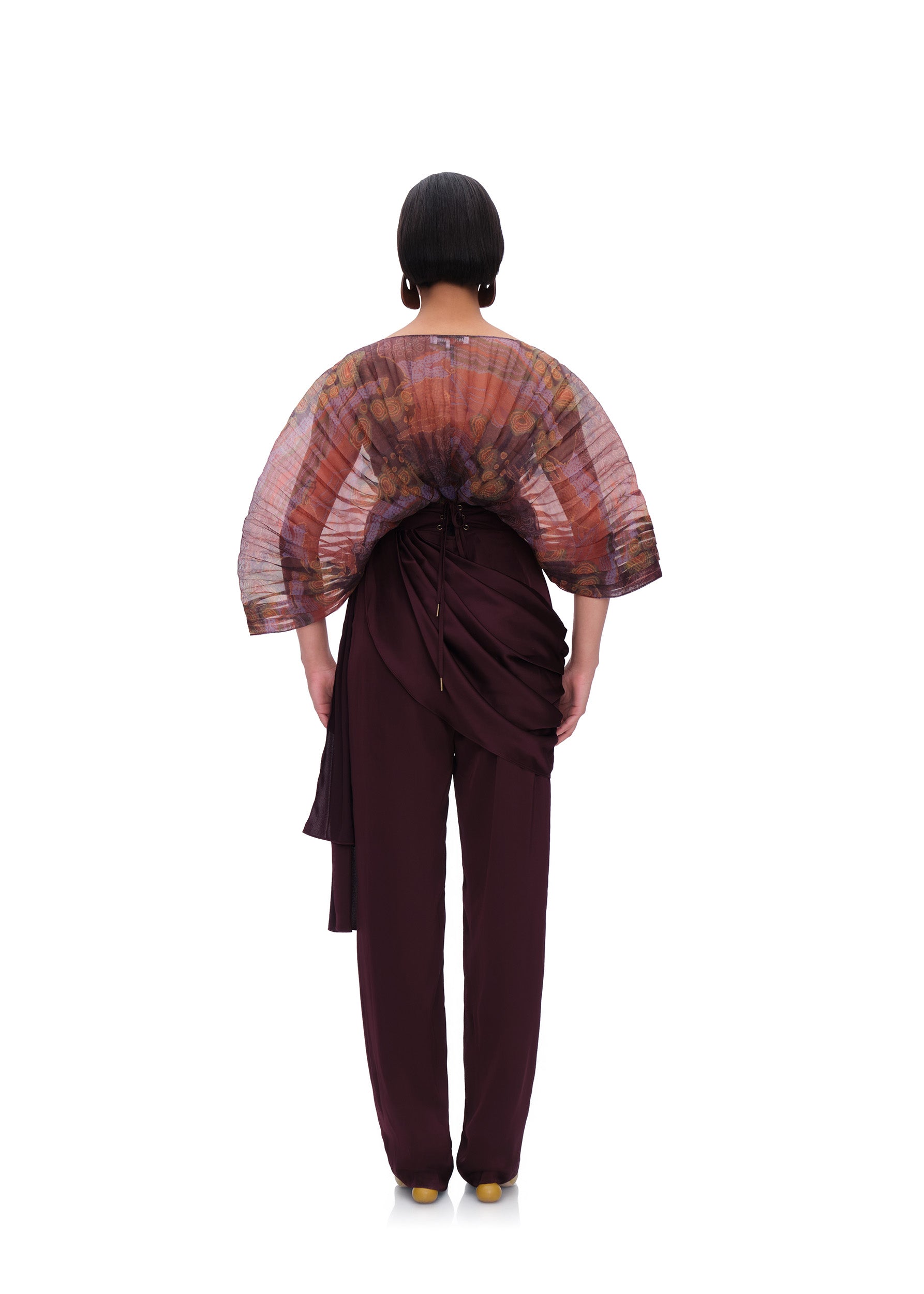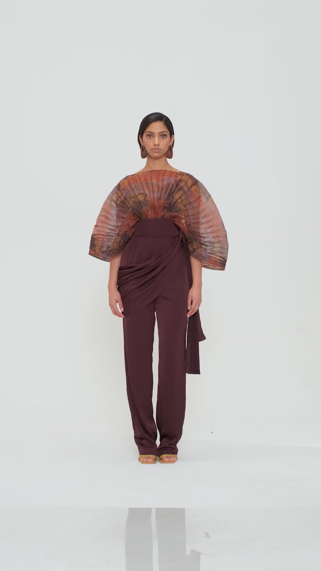 The SOMBRA bodysuit is a sculptural masterpiece and is back in our signature KAVA print. Playing on the delicate nature of organza and the textural appeal of pleats, this style was inspired by the unique patterns and proportions of mushroom caps. The SOMBRA bodysuit features an inner knit leotard layer with a convenient snap closure. Confidently pair the SOMBRA bodysuit with the LOTI DRAPE PANTS.