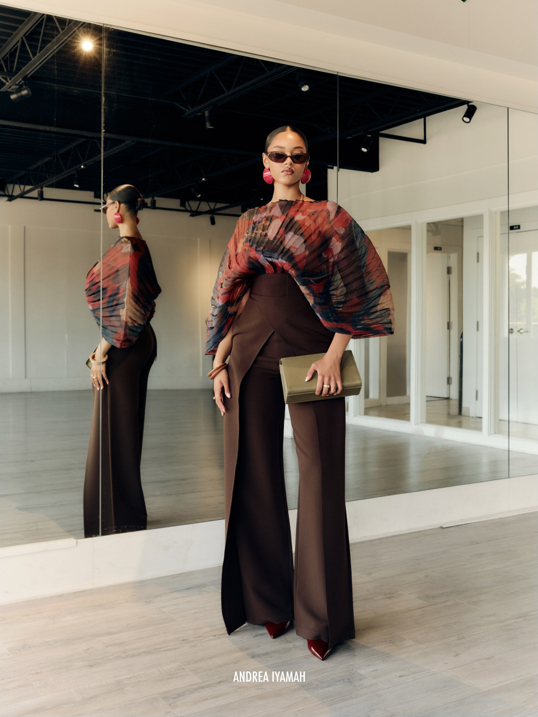 The SOMBRA bodysuit is a sculptural masterpiece and is back in our signature LEWE PRINT. Playing on the delicate nature of organza and the textural appeal of pleats, this style was inspired by the unique patterns and proportions of mushroom caps. The SOMBRA bodysuit features an inner knit leotard layer with a convenient snap closure. Confidently pair the SOMBRA bodysuit with best-selling VIRA PANTS in COFFEE.