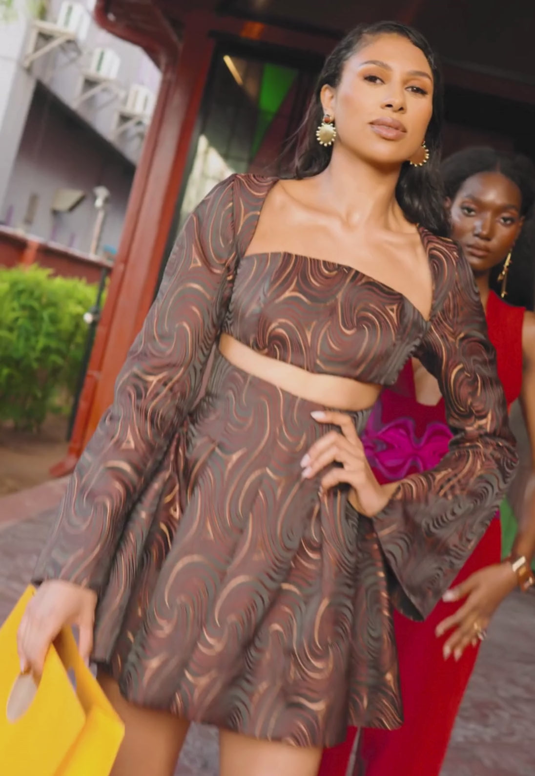The NALA Mini Jacquard Dress blends bold structure with soft volume. Featuring a domed neckline with abdominal cut-out, flared slit sleeves, and a cinched waist with concealed boning, it sculpts the upper body while offering movement through a pleated, flared mini skirt. A functional inner corset, adjustable neck slider, and invisible back zip ensure a secure, flattering fit. Designed to stand out - structured, sensual, and ready for all your special occasions.